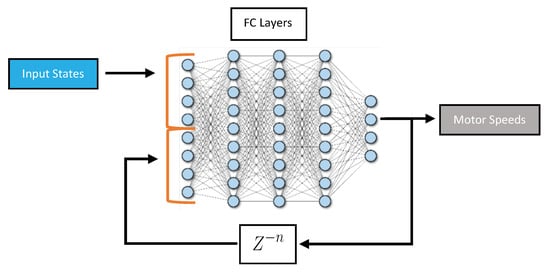 Model-free controllers such as PD Hybrid Artificial Neural Network (PD-ANN) [], Fuzzy Based Backstepping Control [], and Nonlinear Integral Backstepping Model-free Control (NIB-MFC) [] have been proposed to control under system uncertainties and modeling errors, resulting in a significant improvement in low-level control for UAVs compared to classical controllers []. Furthermore, intelligent models based on neural networks can generalize experience from provided data for different operating points, making them suitable for controlling and modeling complex dynamic systems such as UAV low-level control [].