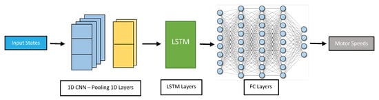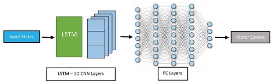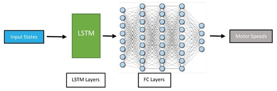 - Long-Short Term Memory (LSTM): These networks are a type of Recurrent Neural Network (RNN) that are designed to handle long-term dependencies in sequential data such as time series data. They use a memory cell to store information over time, which allows them to maintain a long-term memory of past observations. It can be used to learn the patterns and dynamics of the drone’s movements over time. One potential advantage of using an LSTM for drone position control is its ability to handle variable-length input sequences. This can be particularly useful in situations where the drone’s movements are not perfectly regular or predictable: the input sequence could be longer or shorter depending on the complexity of the environment and the level of variability in the conditions. The proposed architecture is shown in Figure 6.