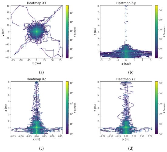 The aim of these signals is to prioritize the number of harmonics, the normal distribution of data, and the balance between information at the transitory state and steady state. Moreover, some trajectories contain disturbances, where it will be possible to observe how the controller recovers in these scenarios. The process to generate this dataset is automatic; the trajectories for each axis and the parameters of these were chosen randomly. We dismissed the signals when the drone fell or was not possible to track the trajectory.