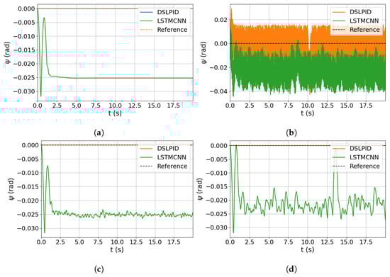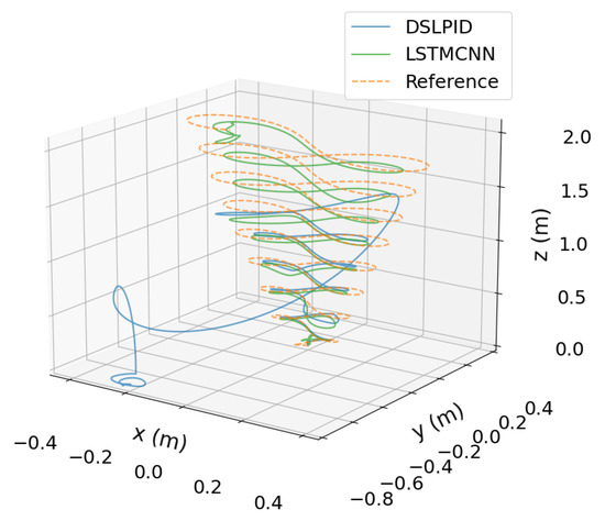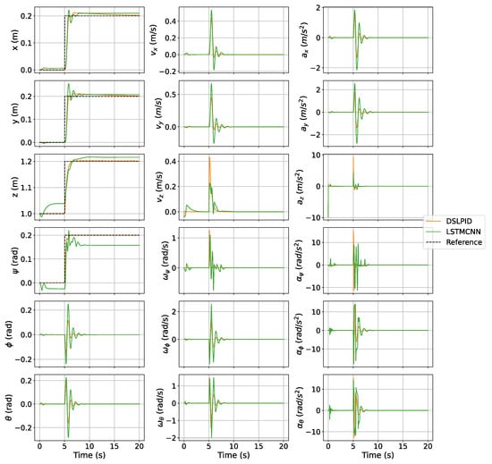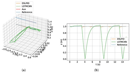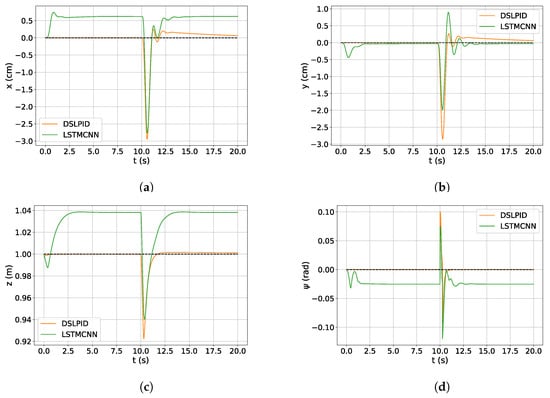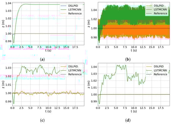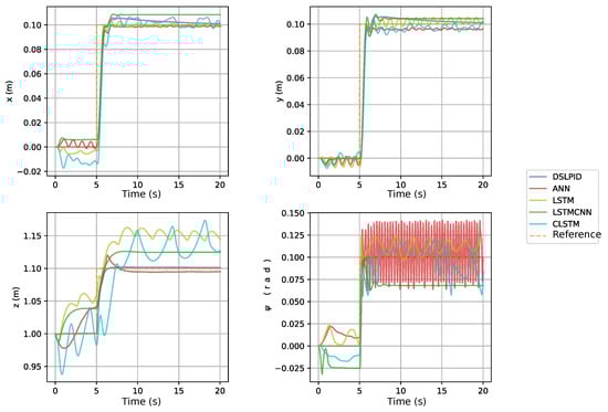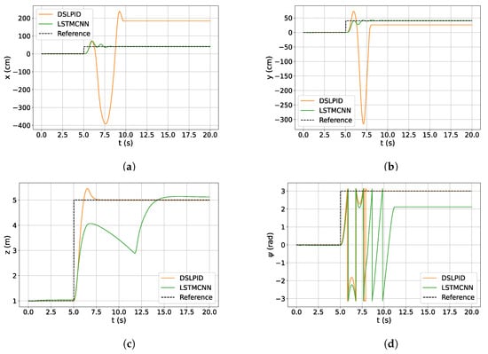 The results of the big-step experiment (Section 4.3.2) demonstrated that the LSTMCNN controller exhibited stability over a wider range of control beyond the nominal operating point in the x and y axes. This indicates its capability to accurately track and control the drone’s position even when subjected to larger step inputs. However, improvements are needed in the z axis and especially in the  axis, where the LSTMCNN controller showed instability. Fine-tuning of controller parameters or architecture may be necessary to enhance performance in these specific axes.