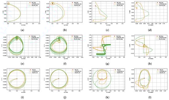 Phase Plane evaluation. (a) Disturbance trajectory x-vx plane. (b) Disturbance trajectory y-vy plane. (c) Disturbance trajectory z-vz plane. (d) Disturbance trajectory r-wr plane. (e) Step trajectory x-vx plane. (f) Step trajectory y-vy plane. (g) Step trajectory z-vz plane. (h) Step trajectory r-wr plane. (i) Sin trajectory x-vx plane. (j) Sin trajectory y-vy plane. (k) Sin trajectory z-vz plane. (l) Sin trajectory r-wr plane.