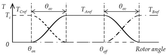 Functions fup(θ) and fdn(θ) depend on start and overlap angles θon and θov (θoff is the start angle of the next phase) and are determined by Equations (3) and (4).