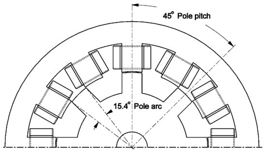This section shows the results of simulation experiments that document the influence of rotor geometry on efficiency and torque ripple optimization objectives. Table 2 lists investigated values of the rotor pole embrace for each rotor geometry shown in Figure 15.