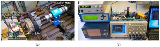 Figure 7 shows the motor test bench and measurement devices. The three-phase asymmetric H-bridge power converter drives the SRM, and an induction motor is used as a controlled load. The torque was measured by Torque sensor KISTLER 4520A20 with CoMo torque evaluation instrument 4700BP0UA (Kistler GmbH, Wien, Austria). After setting the constant current, the motor shaft was fixed at angles from 0 to 360 degrees, and the torque value was recorded to get the static torque profile. The phase inductance was calculated from the voltage, current, power and phase shift values for the first harmonic frequency measured by the Infratek 106A Power Analyzer (Infratek AG, Uetikon am See, Switzerland) at several current values and positions of the rotor.