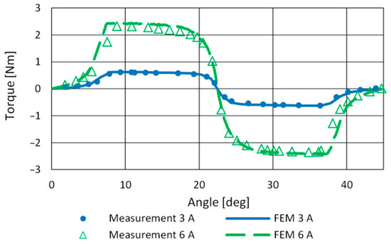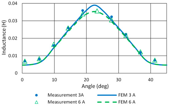 The FEM model of SRM was built in ANSYS Maxwell according to the mechanical dimensions of the motor. Static torque and phase inductance measurement was used for final model tuning. A comparison of measured and FEM inductance profiles of the studied motor is given in Figure 8. The model precision for aligned inductance at 22.5° and the current range up to 6 A is sufficient. Figure 9 shows the measured and simulated torque profile for phase currents 3 A and 6 A. It reveals a slight asymmetry in motor torque generation.