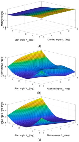 To illustrate the optimization procedure, Figure 10 shows the results of procedure step 3.b (Section 3), which are functions fint(θon,θov) for three objectives obtained by a piecewise cubic interpolation of FEM calculations. The figure displays Motor efficiency η, Relative torque ripple Trip, and Torque ripple RMS TripRMS for one operating point: load torque 1 Nm and speed 600 rpm. We chose the start angle range from 0° to 5° and the overlap angle from 1° to 5° (step 1°) because the region between the minimum inductance and the rising part of the inductance profile in Figure 8 is approximately 5 degrees wide. Selected ranges cover the minimum of objectives Relative torque ripple and Torque ripple RMS, and the number of simulation runs to obtain data for one operating point was 30.