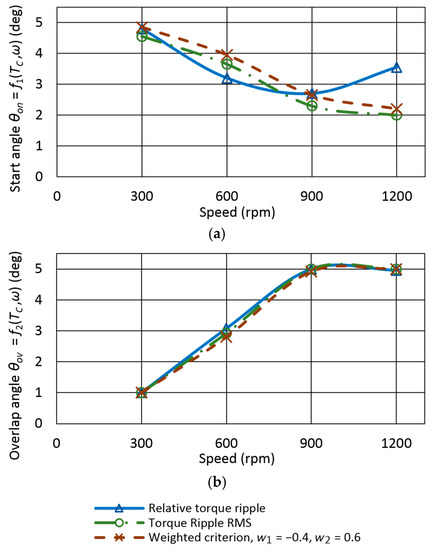 The TSF Equations (2)–(4) used in this research has two parameters: start angle θon and overlap angle θov. It can be expected that the optimal values of θon and θov are different for different motor speeds, torque, and geometry. Besides that, optimal values depend upon the selected objective function. Commonly used objective functions are torque ripple and copper loss. However, various motor applications may require other functions such as motor efficiency, overall converter-motor efficiency, noise, etc. In many cases, multi-objective optimization can be considered [15], or problem-specific criteria can be introduced, as in [19], where authors distinguish between motoring and generating quadrants to avoid negative torque generation.