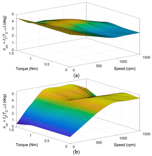 The presented optimization procedure result is a set of points used to construct functions f1 and f2 for calculating optimal angle values in the motor control algorithm in Figure 3. For feasibility reasons, the set of values must be extended to define angles θon and θov at zero speed and zero torque. Figure 12 shows the final form of the functions f1(Tc,ω) and f2(Tc,ω), a cubic spline interpolation of optimal points, for the Torque ripple RMS objective. The control software uses look-up tables instead. It should be noted that the obtained functions are quasi-optimal because of the numerical nature of the presented procedure.