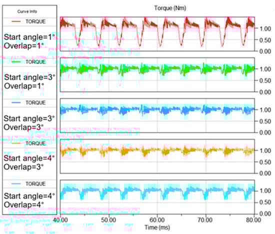 Figure 13 shows the torque waveforms for several combinations of θon and θov. It illustrates that the torque waveforms for values near optimal (θon = 3°; θov = 3°) and (θon = 4°; θov = 3°) at a speed of 600 rpm for the objective Relative torque ripple and Weighted criterion, respectively, have smaller ripples than waveforms for non-optimal values.