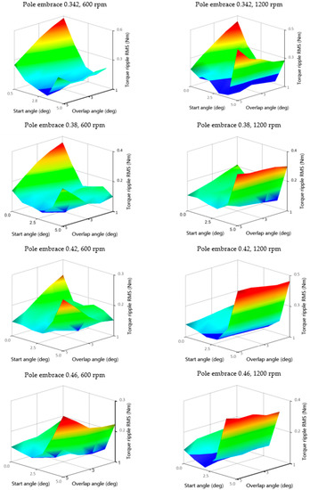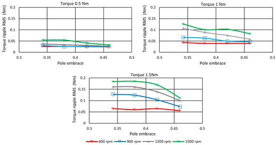 The effect of the rotor pole embrace on Torque ripple RMS TripRMS is shown in Figure 19. The ripple value decreases with the increase in pole width. A more significant reduction is in the range from 900 to 1500 rpm. The pole embrace has a negligible effect on the ripples at 600 rpm (low speed) for all investigated loads. In the case of optimization to the minimum torque ripple, it is not possible to say unambiguously which value of the pole embrace is most suitable. The selection will depend on the operating point at which the motor is most frequently located. If the motor is operated at higher speeds, then the value of the pole embrace can be as high as 0.46, with little loss in efficiency.