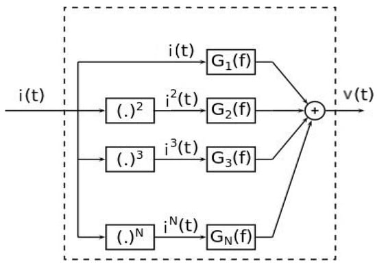 It’s worth noting that a sinusoidal signal of frequency , when used to excite a nonlinear system, results in the generation of multiple higher-order harmonics by the nonlinear block. As a result, the presence of harmonic distortion can be detected by observing the appearance of harmonic components at frequencies that are multiples of the excitation frequency The output of the GHM (Figure 1) can be expressed as a special case of the (diagonal) Volterra model [,], where the power terms , where , play a crucial role in generating harmonic distortion by multiplying frequencies in the system output. Thus, the system output of the GHM (Figure 1) can be represented as: