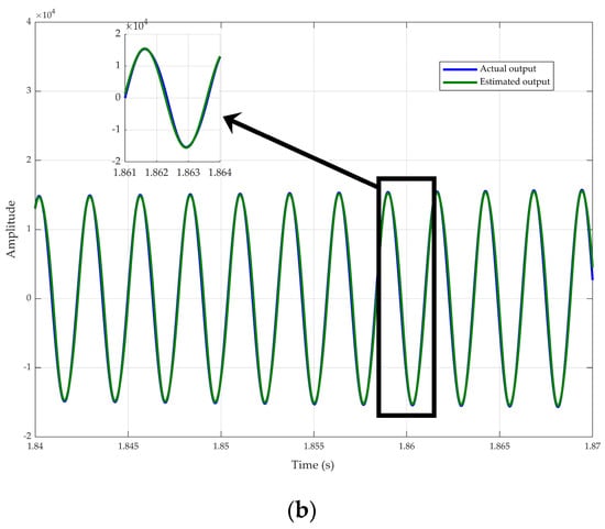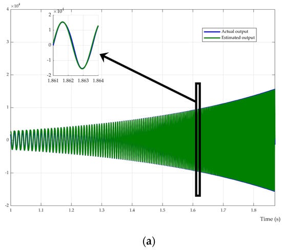 Figure 4, Figure 5 and Figure 6 indicate that the three systems (f), (f), and (f) behave like a first-order system, with a positive slope (+20 dB per decade) and a phase , which is characteristic of a derivative operator. Figure 4 confirms that the linear filter (f) behaves like a derivative function. The efficacy of the proposed methodology is demonstrated using MATLAB/Simulink tools. The input/output signals of the SRM model, generated using FEM software, are exported to MATLAB, and the linear filters and are estimated using the proposed model in MATLAB/Simulink, as depicted in Figure 4, Figure 5 and Figure 6. It is evident from these plots that the SRM can be accurately described by a GHM of order . To compare the proposed model with the actual model obtained using FEM, a swept wave method is used, and the results of this comparison over the entire simulation interval are depicted in Figure 7a. For convenience, a zoom of this comparison is given in Figure 7b. The estimated output signal obtained using the proposed technique is remarkably similar to the actual system output obtained using FEM, thereby demonstrating the effectiveness of the proposed methodology.