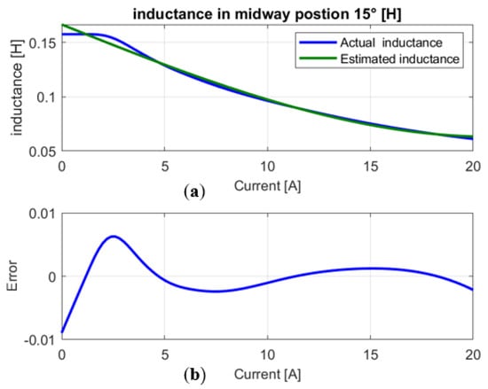 Inductance characteristics of SRM midway position. (a) inductance. (b) error between actual and estimated inductance.