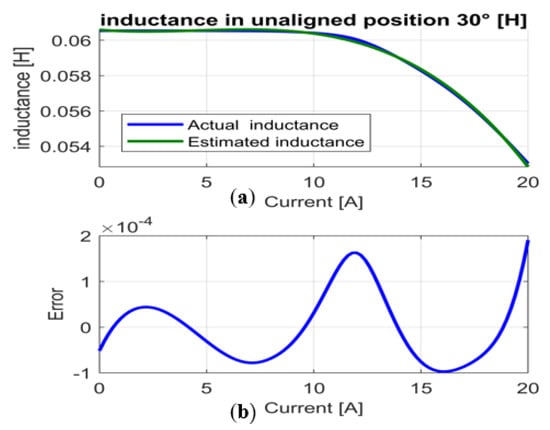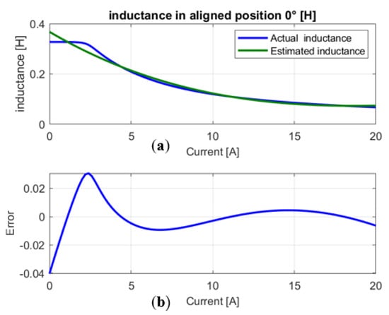 Inductance characteristics of SRM aligned position. (a) inductance. (b) error between actual and estimated inductance.