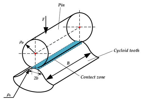 The meshing stiffness of the single cycloid–pin gear pair should be determined to establish the relationship between the loads and corresponding deformation. In this paper, only the contact deformation is mainly considered in the meshing stiffness based on the Hertzian contact theory, which provides much more influence than bending and shear deformations on tooth deflections. The contact model of a single cycloid–pin gear pair is illustrated in Figure 2. Since the size of the elastic deformation is tiny compared with the radial dimension of the pin and cycloid gear tooth, the curvature radius of the contact zone can be regarded as unchanged. Thus, the Hertzian contact stiffness is expressed as