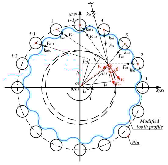 where is the contact force of the th cycloid–pin gear pair, is the external torque and is the elastic deformation of the th cycloid–pin gear pair along the action line. Because the deformation angle is tiny, the formula can be approximately derived.