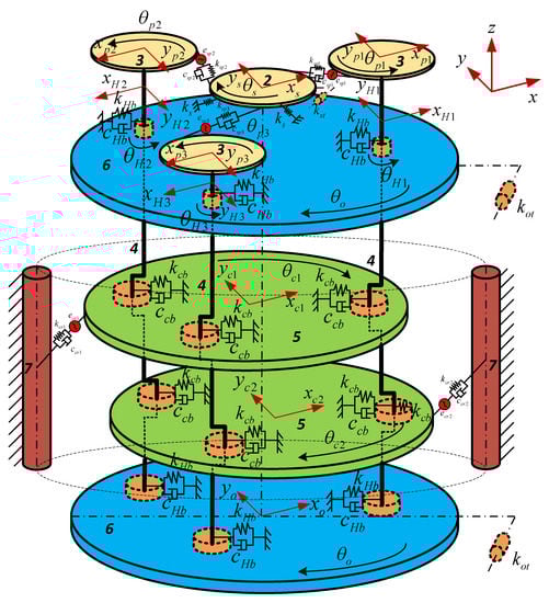 The dynamic model of the whole RV reducer based on the lumped parameter method is shown in Figure 4. The general form of RV reducers consists of planet gears and crankshafts with the number of , and cycloid gears with the number of . Considering the mesh stiffness of gear pairs, crankshaft bending stiffness, bearing stiffness and other factors, a translation–torsion coupled dynamic model of RV reducers is established in this section. Each component possesses three degrees of freedom; therefore, there are degrees of freedom of the proposed dynamic model in total.