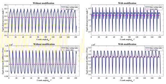 Figure 9 presents the plots of the equivalent pressure angle and mesh stiffness of the cycloid–pin gear pair with and without tooth profile modification. It is clearly seen that both the equivalent pressure angle and mesh stiffness for the two cases vary periodically as the crankshaft rotates. For the case without modification, the equivalent pressure angle varies from about 31.5° to 32.1° with a mean value of 31.9°. The equivalent mesh stiffness shows a sinusoidal shape curve and a mean value of N/m. It is well known that the tooth profile modification of cycloid gears is able to compensate for machining errors, to accomplish easy disassembly and assembly and to provide good lubrication conditions. When the tooth profile modification is applied, a large disparity is observed, in that the mean values of both decrease to 3.8° and N/m, and both their amplitudes increase, with more abrupt changes in a periodic cycle. According to the above contrastive analysis, this indicates that the tooth profile modifications have a significant effect on the equivalent pressure angle and mesh stiffness of the cycloid–pin gear pair, which should be adequately considered in the dynamic model of the RV reducers.