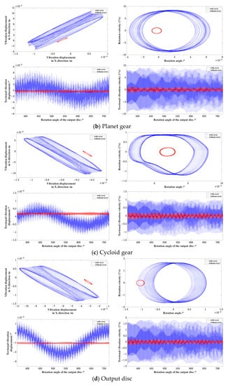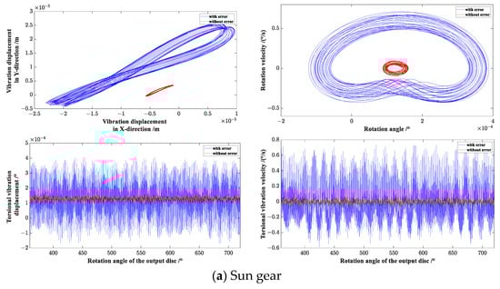 Figure 10a–d show the dynamic responses of the sun gear, planet gear, cycloid gear and output disc for two cases with or without errors. For all four figures, the upper-left subfigures describe the trajectories of the components. It can be observed that the trajectories appear to be a series of complicated and closed curves, which make it hard to judge the motion states based only on the perspective of the motion trajectory. Moreover, the motion space without errors is much smaller than that in cases with errors, which implies that the vibration displacements of the components are sensitive to system errors.