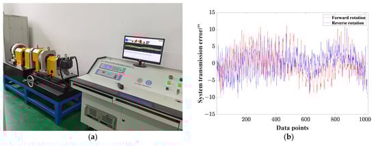 System transmission error test of the prototype: (a) the test platform; (b) plots of the system transmission errors.