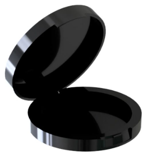 The goal of this LCA was to analyse the environmental impacts generated when mass-producing the cosmetic compact shown in Figure 1 using FFF and IM. The cosmetic packaging is manufactured by Toly Products Ltd. (Żejtun, Malta) in ABS and comprises a lid and base assembled using a pinned hinge. Hereafter, the term ‘compact’ is used to refer to the cosmetic packaging assembly including the lid and base only, while the term ‘component’ is used to indicate the individual lid or base that create the compact.