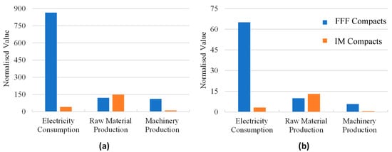 The first phase of the compact’s life cycle is raw material production. In both processes, material extraction involves the raw material, energy consumption, and generated emissions. ABS granules were used for both technologies; however, the granules go through an additional process of extrusion to create filaments for FFF, which was included in the assessment. The mass of one compact includes the mass of the lid and base, as well as the runner system for IM. For FFF, no support material was required to print the components. The greater mass of ABS required generates a greater impact. Although the Ecoinvent database contains extensive information on the CO2 footprint and embodied energy of raw material production, the extraction of data using SimaPro is sometimes complex. Therefore, Ansys GRANTA Edupack was used to obtain the relevant information on ABS production []. In Table 1, the embodied energy, which is the energy required to produce one kilogram of raw material, as well as the carbon dioxide produced and released to produce one kilogram of material can be found allocated to the production of the ABS compacts. Due to the greater amount of ABS required for the moulded compact, the embodied energy and CO2 footprint for the IM compact are greater compared to using FFF. This indicates that the environmental impacts associated with the production of raw material for the FFF compacts should be lower, emphasizing the advantage of FFF in terms of the maximisation of material utilisation.