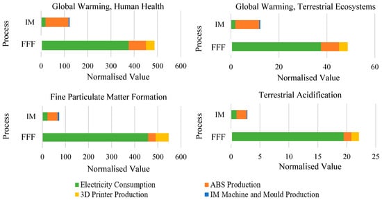 Comparing the obtained results to the literature, various similarities were noted. FFF maximises material utilisation, which was highlighted in the greater impacts generated by IM raw material production when compared to filament production. Furthermore, as explained previously, the results from energy consumption studies vary significantly. The results obtained in this study show that the consumption of FFF is twenty times greater than using IM, which agrees with findings from Kurman and Lipson, and Yoon et al. [,]. Carrying out optimisation of process parameters would lead to a reduction in energy consumption during printing, which would reduce the associated environmental impacts [].