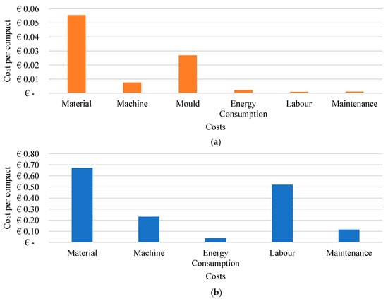 The costs used to calculate the CPC using both processes were provided by Toly Products in 2021. The printer cost was modelled after the Prusa i3 printer at EUR 800. Furthermore, one IM machine costs EUR 195,000 and EUR 40,000 per mould. The machinery costs were attributed to one compact using simple linear depreciation using the lifetime and utilisation rate of the machines, as explained in Section 2.1. The labour costs were modelled following 120 h a week for 36 weeks at an hourly rate of 12.50 EUR/h, with the IM machine requiring operators for 6% of the yearly working hours, as instructed by Toly Products. The printer set-up and part removal time per build was taken as five minutes, and four hours per machine are required to set up the IM machines. The material cost for ABS granules and filaments were 1.85 EUR/kg and 30 EUR/kg, respectively. Energy consumption costs were modelled using Band 9 for non-residential consumption tariff rates from Enemalta plc in Malta at 0.109 EUR/kWh []. The yearly maintenance fee per printer and IM machine is EUR 80 and EUR 2000, respectively, as advised by Toly Products.