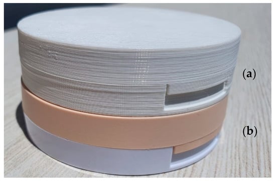 For visual quality, the average dimensions of ten IM compacts were all within the specified limits, while the dimensions of the FFF compacts were not within the acceptable limit due to thin walls, which create a challenge during printing. Moreover, the lid and base mismatch for all compacts was within the acceptable limits. Multiple visual defects were observed for the 3D-printed parts. Rough surface finishes were obtained due to the stepping effect caused by the printed layer thickness, as can be seen in Figure 5. Stringing was also noticed, where thin filaments were left on the compact by the extruder nozzle. Conversely, and as expected, the IM compacts were of superior visual and aesthetic quality, with a smooth and glossy finish and no visible defects. To obtain better surface finish for the printed parts, additional post-processing would be required to reduce the appearance and texture of the layer lines. However, this would continue to increase costs.