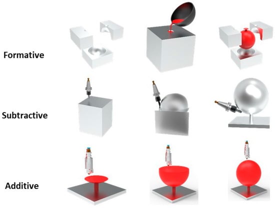 According to international standards (ASME AM223, DIN 8580), manufacturing processes can be divided into three categories: subtractive, additive and formative (Figure 1) [,,,]. More specifically, SM processes, such as turning, drilling and milling, start with a stock part or bulk material, removing material until the desired geometry is created. In AM processes, material is selectively deposited in successive layers until the final geometry is reached. Finally, in formative processes such as casting and forging, the bulk material is shaped into the desired geometry through molds and tools. Table 2 presents a generic comparison of manufacturing process categories.