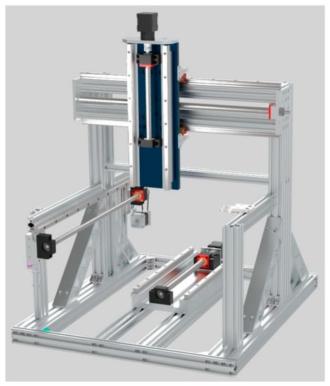 Comparing metals and plastics is not easy, as metals have significantly higher strength and modulus of elasticity, but they also weigh more and are harder to process. It is important to note that both the studied steel and aluminum alloys, which are appropriate for the specific application, have similar strength to weight properties, as indicated by the specific modulus E/ρ ratio, while high quality aluminum has a significant strength advantage over weight. Following a material section process for the machine components, as proposed by Ashby [], aluminum profiles were selected for quick and easy assembly. Additionally, an advantage is the structural rigidity of aluminum profiles, which are crucial for machine accuracy. Figure 3 depicts the resulting HMT frame after the study on material and strength with FEM (see following Sections).