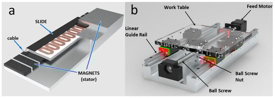 (a) Direct feed drive system (linear motor) []. (b) Indirect feed drive consisting of motor, coupler, ball screw and its supports, nut, nut housing, linear guides and blocks. Blocks and nut/nut housing are held together by a common mounting plate.