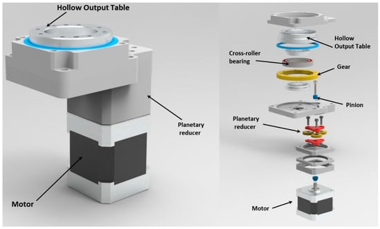 A hollow rotary table (Figure 6) is a rotary load device [,]. It uses spiral conical gears whose contact teeth design offer uniform loading, thus, high torque and high transmission efficiency, high accuracy and high-cost efficiency. Combined with a planetary reducer, the transmission ratio reaches 1:180. Mounting accuracy is comparable to the direct drive motor which can carry the idle load in a short time. A cross-roller bearing is used in the hollow table, which allows both high load and high rigidity. Tables and arms can be installed directly on the output table. This saves design time and construction cost of an installation mechanism, the installation of necessary mechanism components, voltage adjustment of a belt, etc., when mechanical components such as the belt and pulley are used for installation. The large diameter of the output table hole helps reduce the complexity of wiring and piping, thus simplifying the design of equipment. Hollow rotary tables were chosen for the B and C rotary axes because of their high torque output (see Figure 7b).