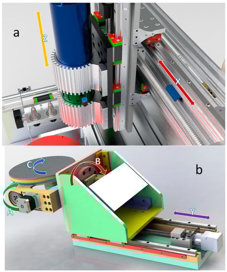 Figure 7 presents two main subsystems of the proposed HMT; specifically, Figure 7a presents the linear axes X and Z with the mounted spindle, whereas Figure 7b illustrates linear axis Y and the rotary axes A, B and C. Both these main subsystems of the HMT are mounted on the machine tool frame, as depicted in Figure 3, where only the linear axes X, Y and Z appear.