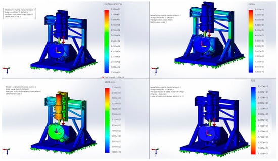 The static analysis shows the behavior of the structure under constant loads. From static analysis, structure deformations and stresses were obtained. The structure was examined in two different cutting conditions; the first is cutting forces during simultaneous three-axis machining and the second is during drilling. Table 7 and Table 8 present the static analysis results.