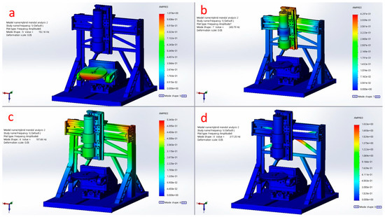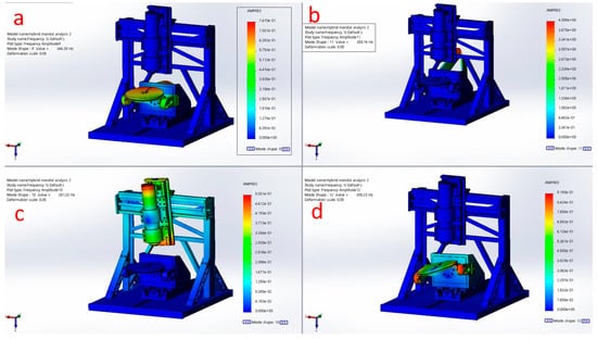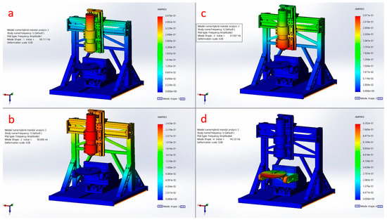 As with any mechanism with moving or rotating parts, vibrations can appear during hybrid machine tool operations. These vibrations must be calculated and addressed properly ideally from the machine design stage, as they can cause deformations of the machine structure, leading to part failure or even, in extreme cases, to machine tool failure. Vibrations can be described as a set of mode parameters, including natural frequency, operation pattern and damping. Natural frequency is an important component of the resonance effect. If the external excitation frequency is the same as that of the structure, it can cause permanent deformations [,]. In the literature, three types of dynamic structural analysis techniques are known: (a) the distributed mass beam method, (b) the irradiated fixed beam method, and (c) the Finite Element Method/Analysis (FEM/FEA). FEA is one of the most useful tools for simulating physical models, from very simple to very complex ones, and in most cases, such as the one analyzed in this study, it is considered appropriate and efficient enough. Analyses’ accuracy performed on CAE software depends mainly on the structure and the quality of the mesh. In this work, the dynamic characteristics of machine tools were studied using FEA, as it incorporates material properties, geometric properties and boundary conditions.