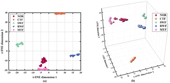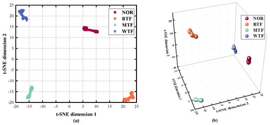 - The t-SNE can effectively remove redundant features in high-dimensional fault feature sets, thus obtaining a sensitive and easily classifiable low-dimensional feature set.