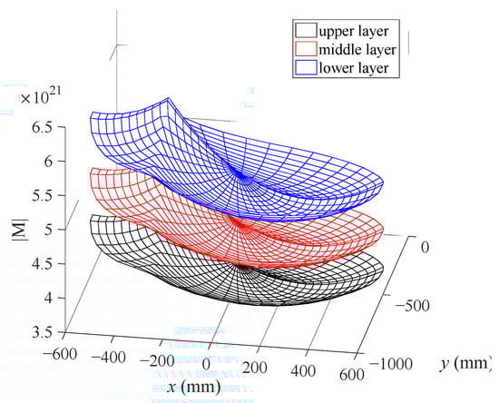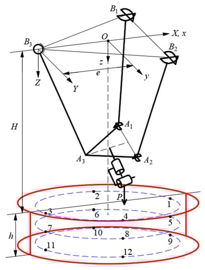 As shown by the red line in Figure 4, the task workspace of the hybrid robot is a cylinder whose radius is 600 mm. h = 300 mm is the height of the workspace, H = 1650 mm is the distance from O to the upper bound of the workspace and e = 422.5 mm is the distance between the Y to y axes of O-xyz. According to the practical application requirements, the required range of the posture of end-effector is specified as and . To ensure that the robot is not singular in the workspace, we investigate the singularity of matrix M in Equation (48). The distribution of the minimum of determinant of matrix M under the required posture range in the lower layer where z = 1900 mm, middle layer where z = 1800 mm and upper layer where z = 1700 mm of the workspace is shown in Figure 5. It can be seen that the determinant of matrix M is far away from zero in the workspace, so matrix M is nonsingular in the workspace, which ensures the rationality of subsequent analysis.