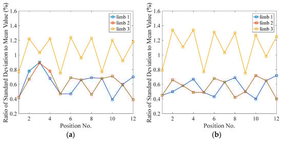 Figure 11 and Table 2 show that when the double limbs are on the top, limbs 1 and 2 require smaller average maximum absolute values of driving force while limb 3 requires larger average maximum absolute values of the driving force, which indicates that the arrangement of the limbs has different effects on the dynamic performance of different limbs. Considering that the double limbs and the worktable or workpiece are prone to interference when the double limbs are on the bottom, the double limbs are often on the top when the robot is placed horizontally in practical application.