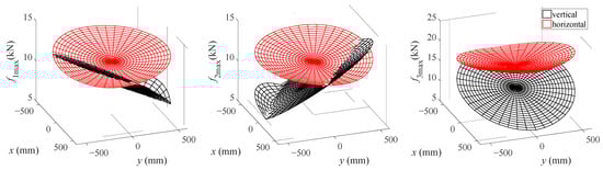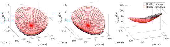 The arrangement of the limbs in horizontal placement will also affect the dynamic characteristics of the robot. The three limbs of the parallel mechanism in hybrid robot are usually arranged symmetrically due to the symmetrical structure of the mechanism, so there are two cases of double limbs on the top and double limbs on the bottom. The indices fgi (i = 1, 2, 3) and fimax (i = 1, 2, 3) in the middle layer of the workspace in the two cases are calculated by the MultiStart solver of Matlab 2016b, as shown in Figure 10 and Figure 11, and is listed in Table 2. Figure 10 shows that when the double limbs are on the top, the double limbs need to provide tension for the gravity term of driving force while limb 3 needs to provide thrust for the gravity term of driving force; when the double limbs are on the bottom, the double limbs need to provide thrust for the gravity term of driving force while limb 3 needs to provide tension for the gravity term of driving force.