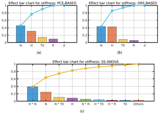 Sensitivity analysis for Model 1 (Section 2) using three different approaches. The bar-chart plots show the contribution (height of each box) of each factor (x-axis) to the total variance of the stiffness. For each plot, the cumulative sum of the variables in the x-axis equals one. Image (c) also shows the second-order interaction effects. (a) Polynomial chaos expansion-based analysis; (b) distributed random forest-based analysis; (c) smoothing spline analysis of variance sensitivity analysis.