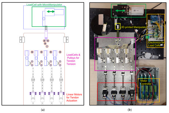 A comprehensive experimental setup was designed to validate the stiffness model and sensitivity analysis results, as shown in Figure 6. Specifically, this design focused on implementing a setup providing high accuracy, reliability, and repeatability, which are required to ensure the acquisition of trustworthy experimental results that enable appropriate comparisons with theoretical models.