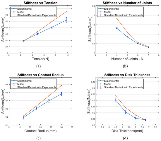 Experimental results—stiffness variation as a function of each design parameter: (a) stiffness versus tension (T); (b) stiffness versus the number of joints N; (c) stiffness versus radius of contact (R); (d) stiffness versus disk thickness (H).