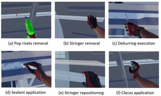 VR has been used for reproducing the working environment and simulating the task. The task reproduced is an aircraft fuselage panel assembly task and it consists of the application of sealant on a stringer. The task includes several operations to be completed, which involve the use of different tools. For privacy reasons, it is not possible to describe the operations in detail, but a general overview is given in Figure 1, where the main operations of the entire task are represented in the VR environment, and in Table A1 in Appendix A, where the errors made during the task are listed. It is worth noting that the task simulated is the reproduction of a real industrial task and it was not properly created for pursuing the objectives of this paper.
