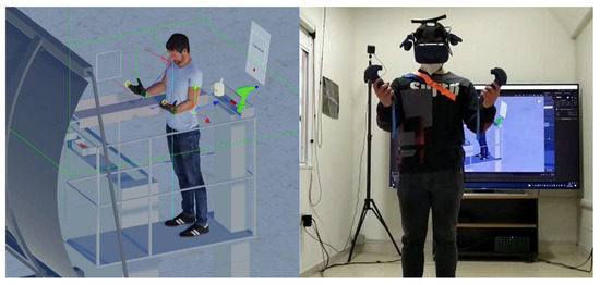 For realizing the virtual simulation, the HTC Vive Pro® system was used, while the software used to build the interactions among objects and human players was Unity®. Figure 2 shows the simulated and real environments.