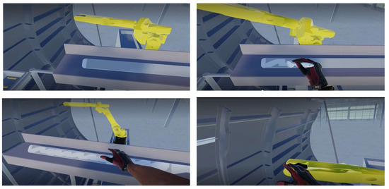 The use of VR tools falls within the scope of promoting or testing efficient and safe industrial systems and improving the worker’s well-being [15,16] through digital tools developed during the era of the fourth industrial revolution. In HRI context, the use of digital tools represents a strategic way to enable dynamic and safe analyses. Among several tools, VR reproduces the working environment, simulates the production system, and allows for the quick, safe, and economical interaction between humans and robots [17]. For years, the use of VR has been validated as an effective tool to simulate industrial HRI systems [18], and it has demonstrated that it can provide performance assessments of HRI systems [19], including errors [14].