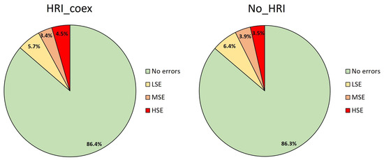From this first analysis, the reader can observe that the difference on the number of errors committed is only 0.1% between the two groups (13.6% for HRI_coex group and 13.7% for No_HRI group). A small difference can be found in the type of errors made. In particular, the HRI_coex group has a higher percentage of high-severity errors.