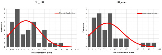 The boxplots show similar characteristics for the two groups, even if the HRI_coex group shows a number of outliers higher than the No_HRI group, which, instead, presents a higher spread of data. A feasible interpretation of this fact may be that the people of the HRI_coex group seem to pay more attention in the tasks’ execution, but the effect of the presence of the robot has some kind of impact, generating more errors (three outliers, represented by circles in Figure 6) in some cases.