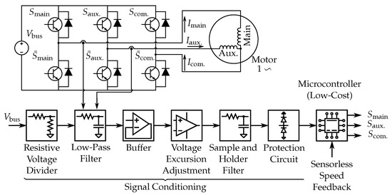 According to the literature, employing a frequency inverter with rotation measurement can lead to a significant reduction in energy consumption, such as up to 43% with a single-phase motor [14]. However, the incorporation of a rotation sensor may increase costs, and the availability of symmetrical coils can be limited. To address these challenges, a more versatile control approach has been proposed, capable of handling asymmetrical coils [15,16,17] and enabling sensorless control by estimating the motor’s variables [18].