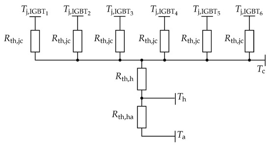 The designed converter model underwent simulation to obtain the current and voltage values in each IGBT for the steady-state condition, as well as the switching times. The total losses were calculated using the IGBT parameters provided in the datasheet. To model the thermal conditions in the steady state, a thermal circuit, as shown in Figure 6, was employed [35,36]. Subsequent simulations were conducted to determine the required thermal resistance of the heat sink in order to maintain the junction temperature within a safe limit of 140 °C, as depicted in Figure 7.